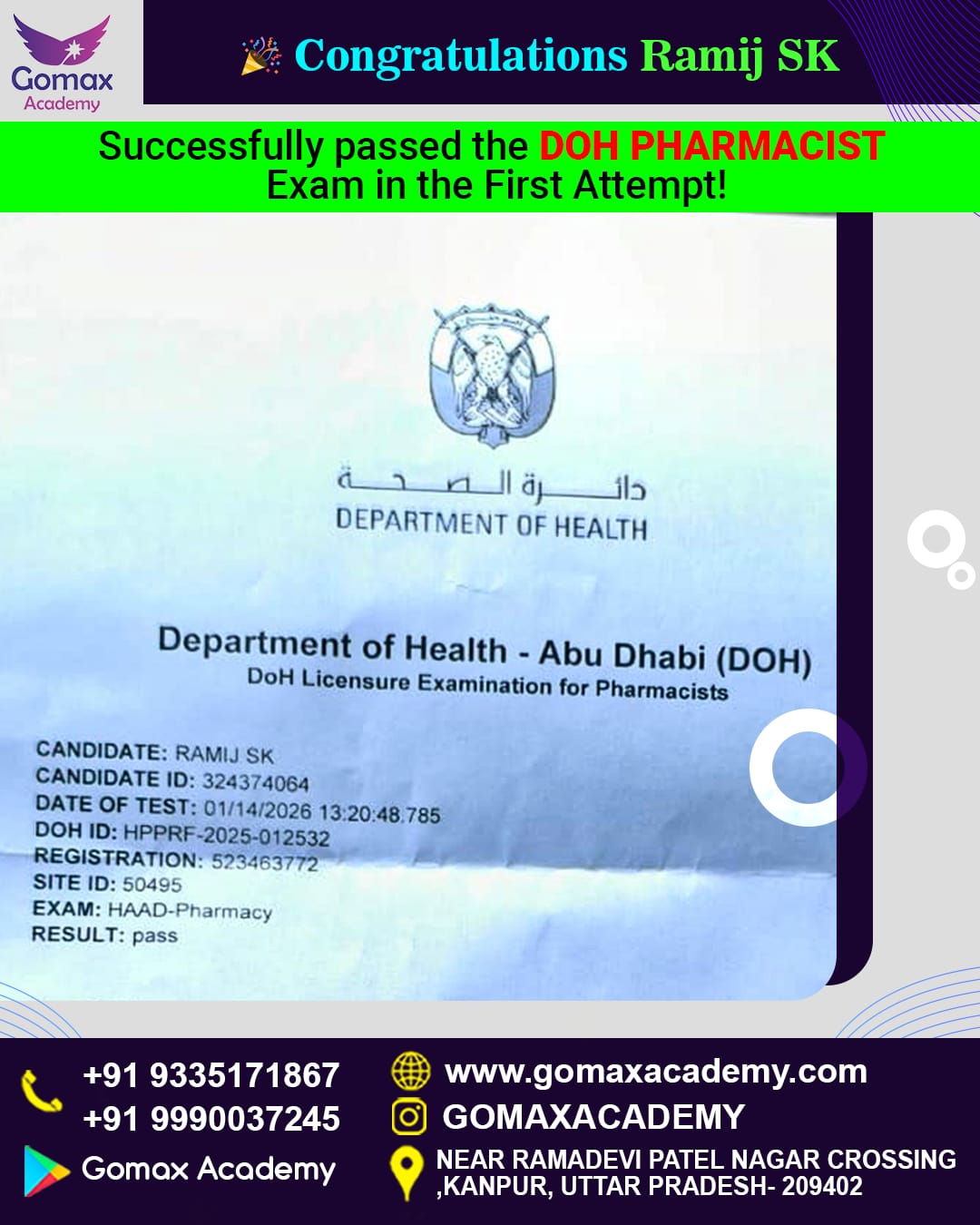 "Ramij SK cleared the DOH Pharmacist in his first attempt with Gomax Academyβs expert guidance."