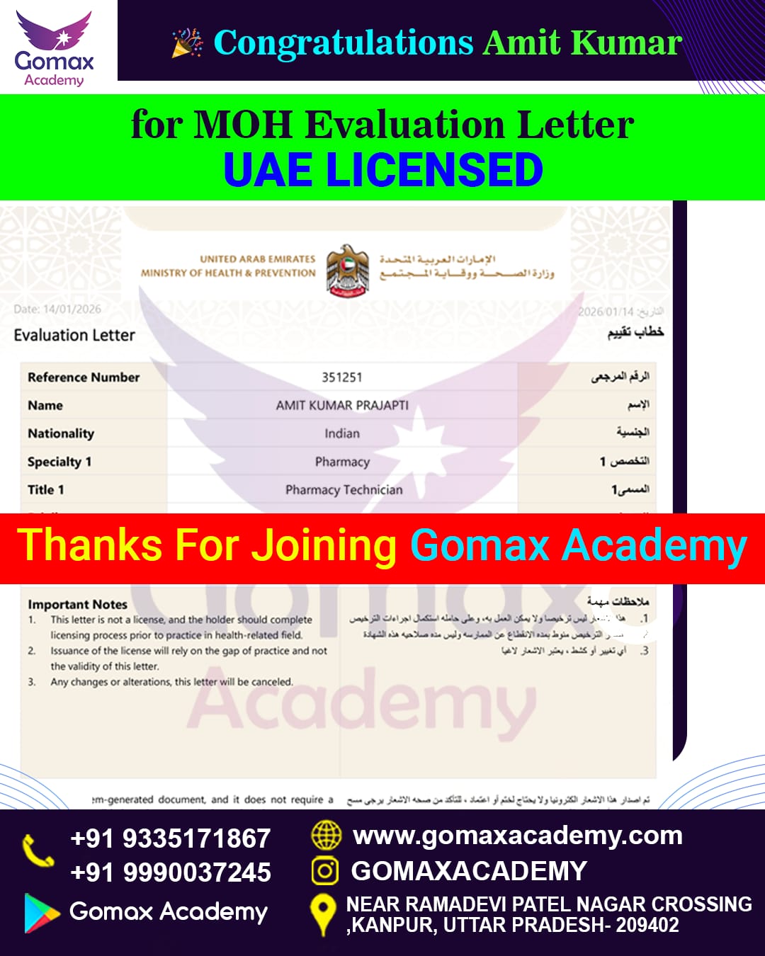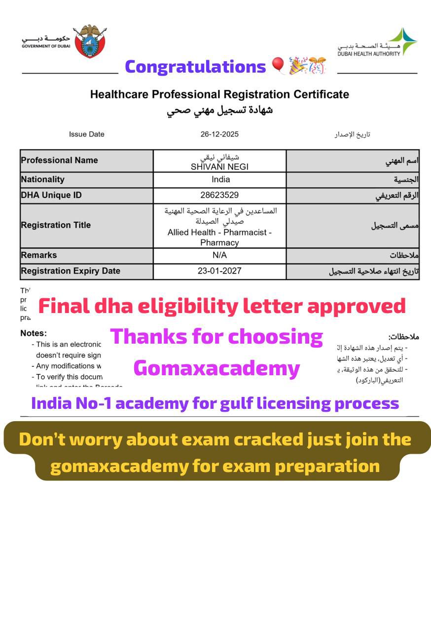 "Yavindra Singh successfully cleared the DHA Assistant Pharmacist exam in his first attempt with the guidance of Gomax Academy. Through structured live classes, updated MCQ practice, expert faculty support, and complete exam guidance, he achieved his Dubai healthcare licensing goal."
