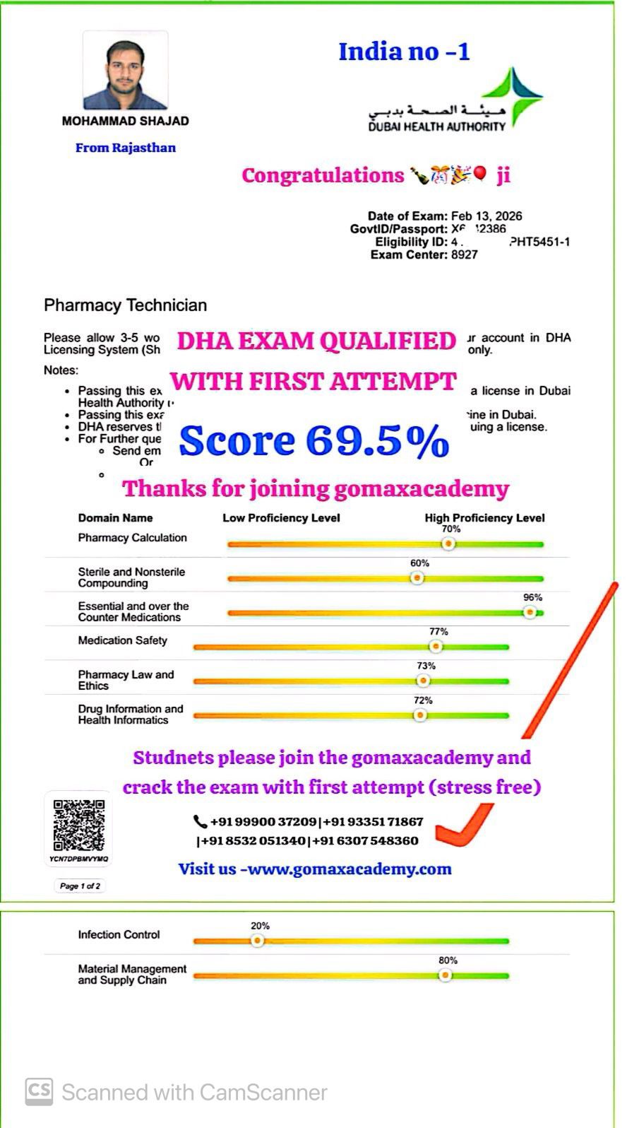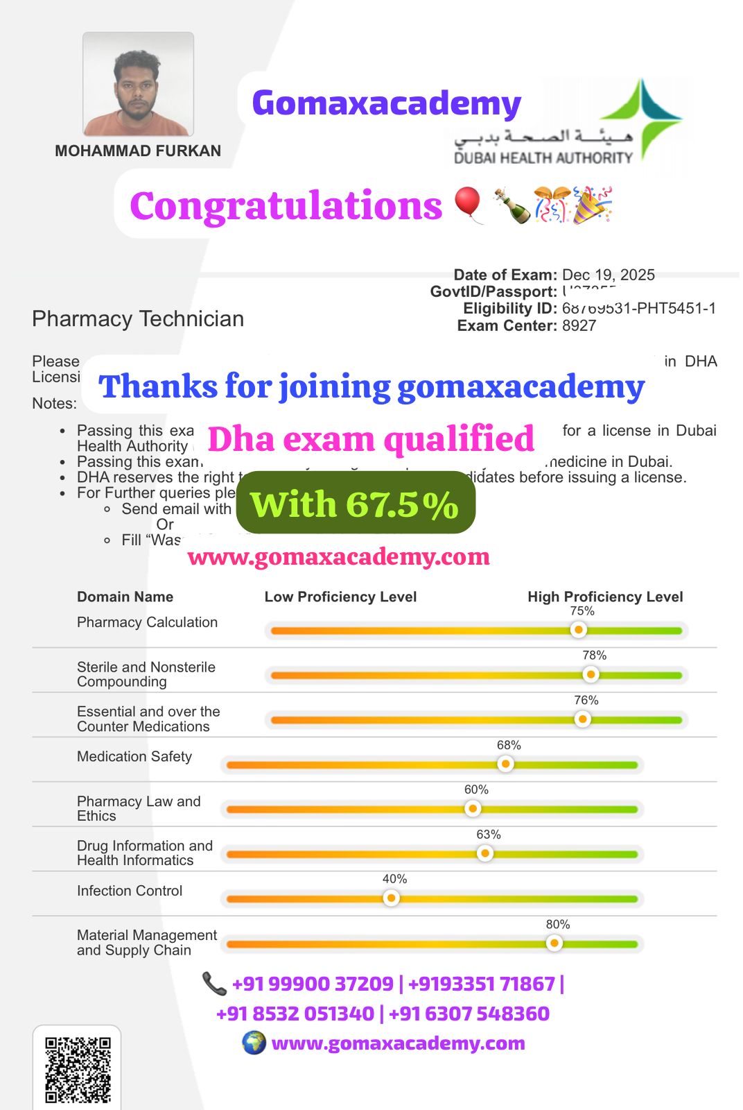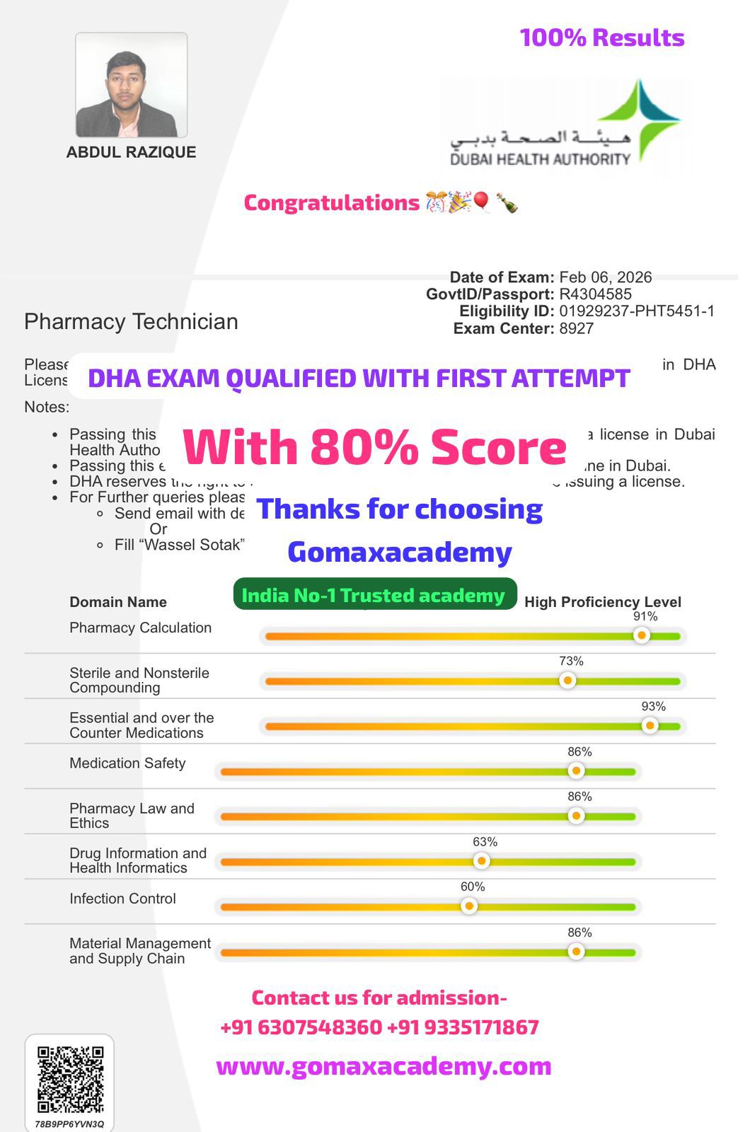 "π SUCCESS STORY β DHA PHARMACY TECHNICIANπ Mohammad shajad has successfully qualified the DHA Pharmacy Technician Exam in the first attempt with an excellent 69.5% score β "