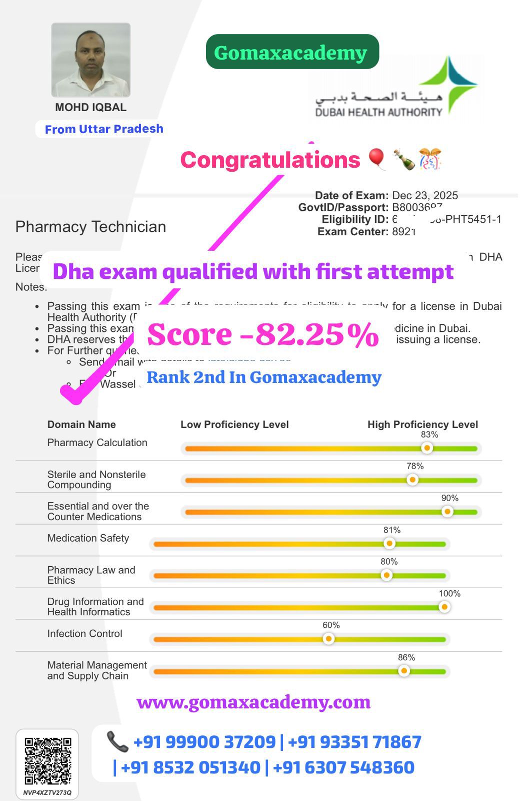 "Mohammed Iqbal cleared the DHA Pharmacist Tech exam in his first attempt with Gomax Academyβs expert guidance."