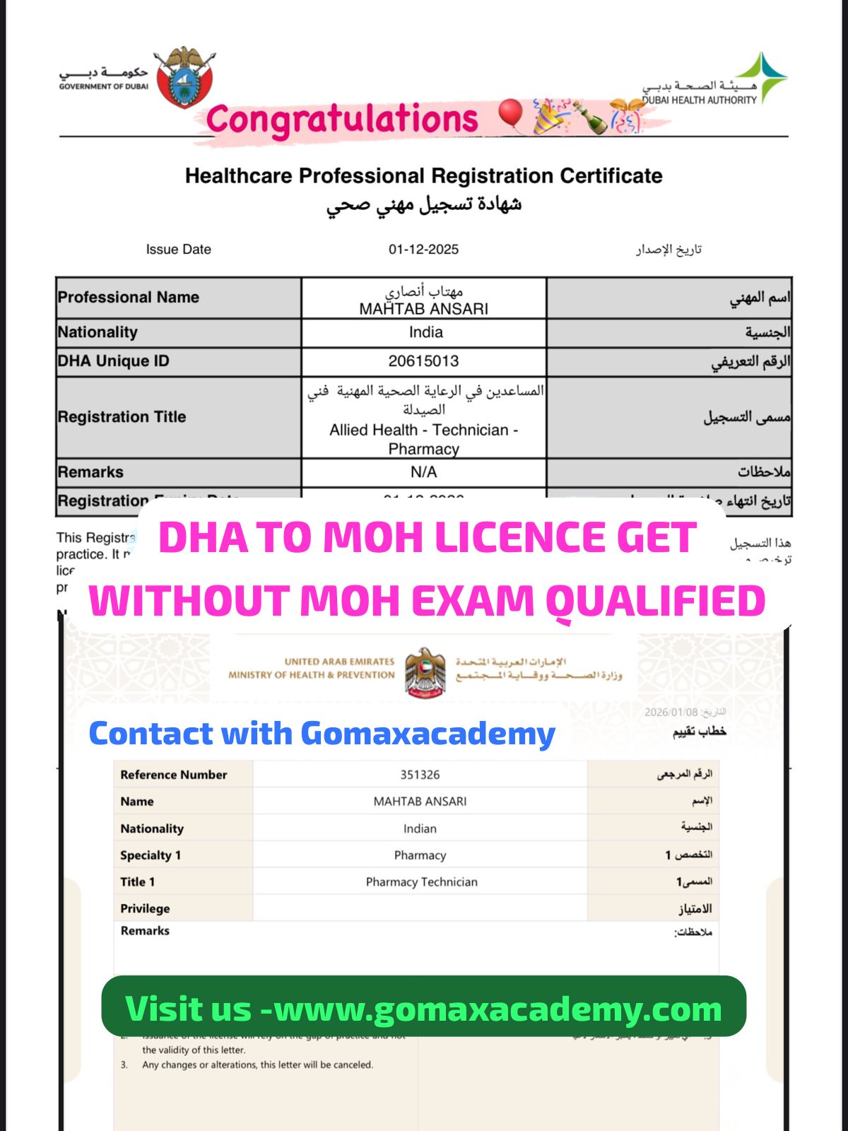 DHA success story, MOH exam cleared, Gomax Academy results, Gulf healthcare jobs.