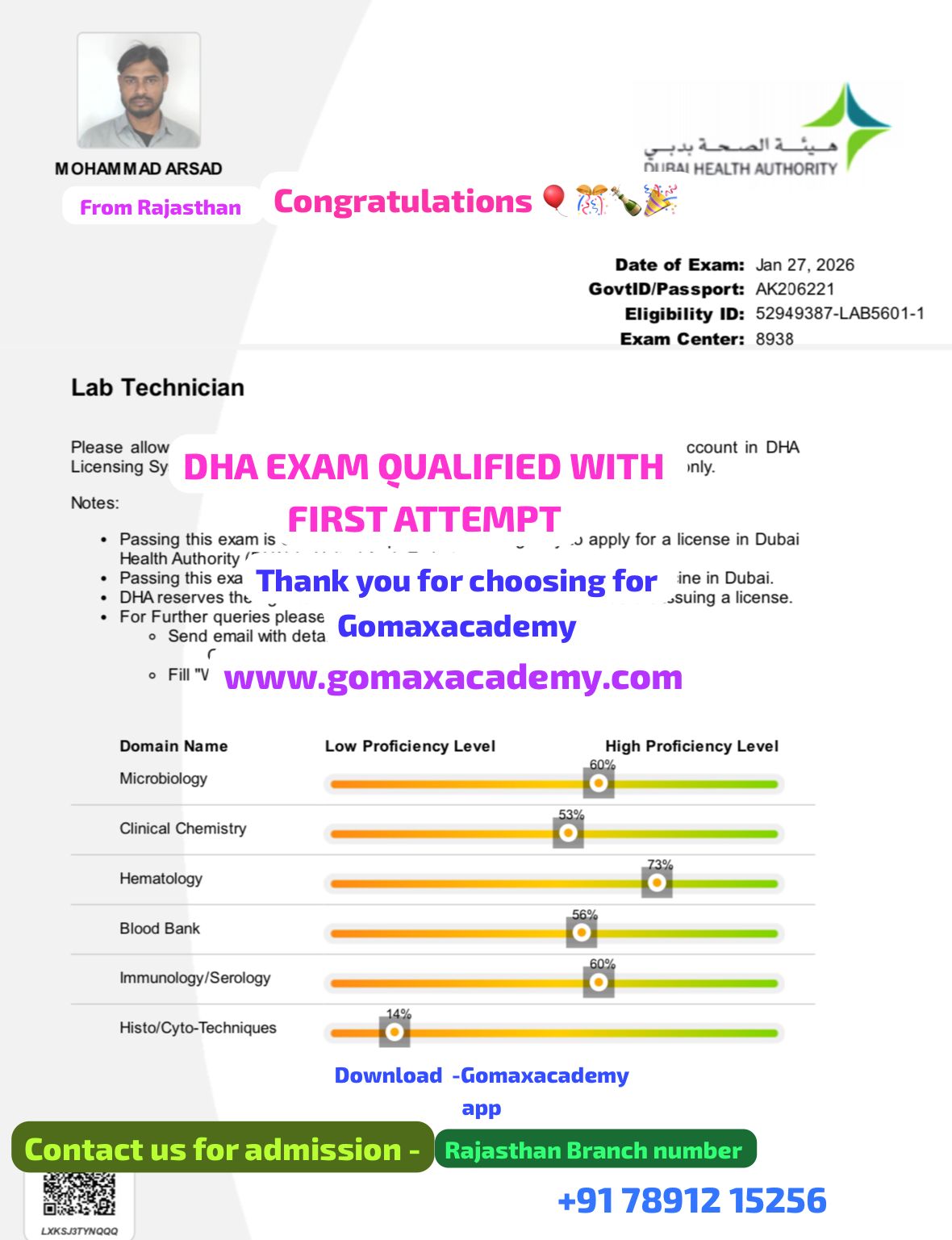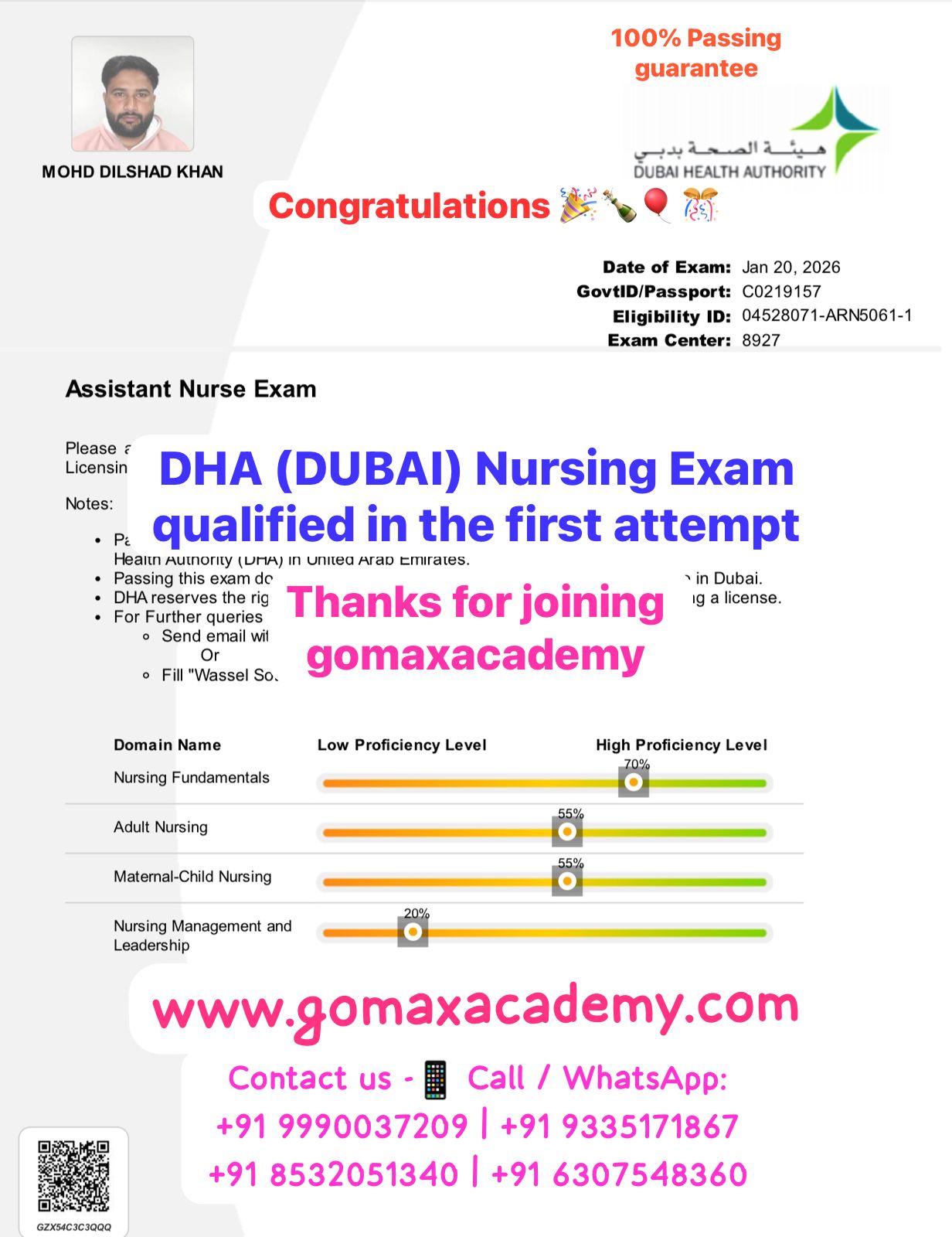 "Mohd Dilshad Khan cleared the DHA Assistant NURSE exam in his first attempt with Gomax Academyβs expert guidance."