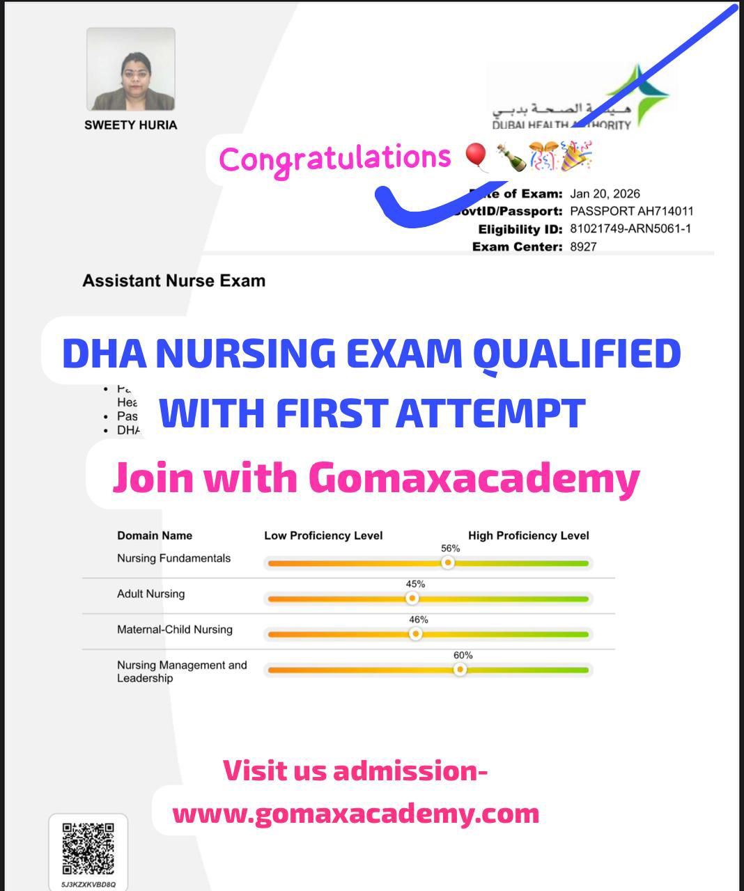 "Pooja Rani cleared the DHA Reg Nurse exam in his first attempt with Gomax Academyβs expert guidance."