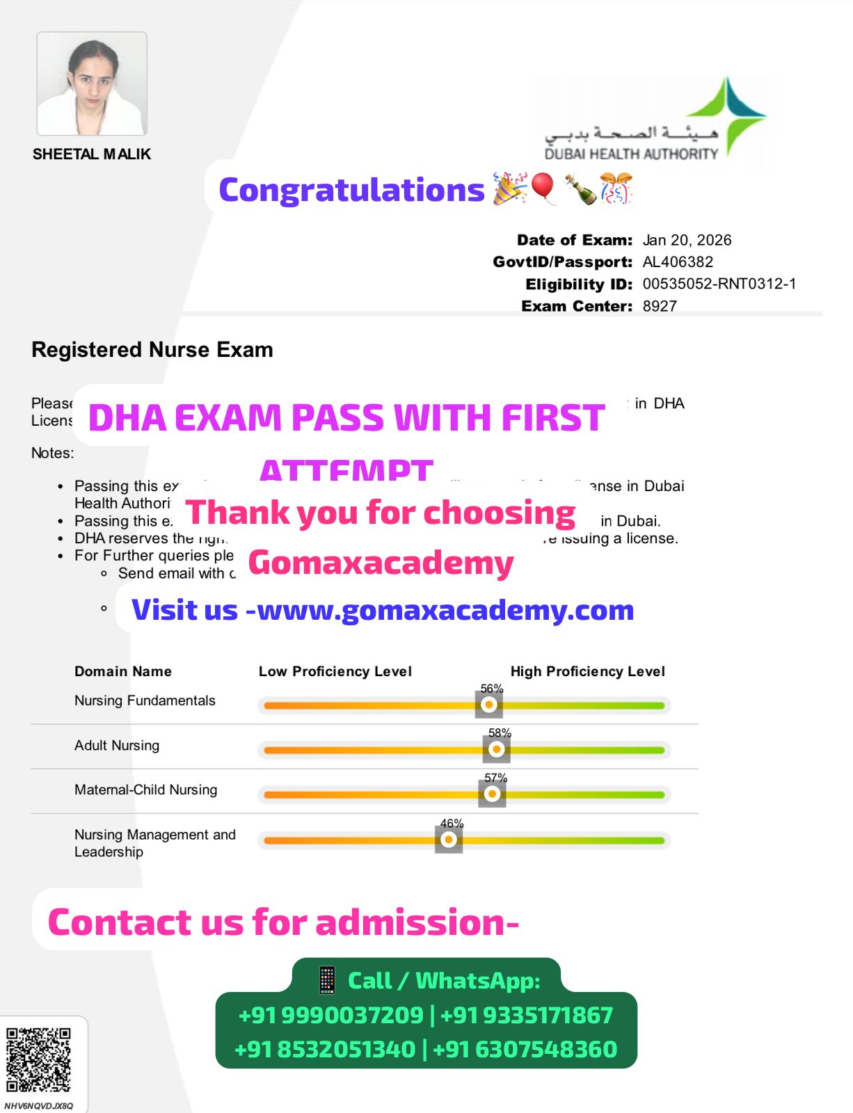 "Sheetal Malik β DHA Registered Nurse Exam Qualified π₯ First Attempt Wishing you great success in your Gulf nursing career πβ¨ β Team Gomax Academy"