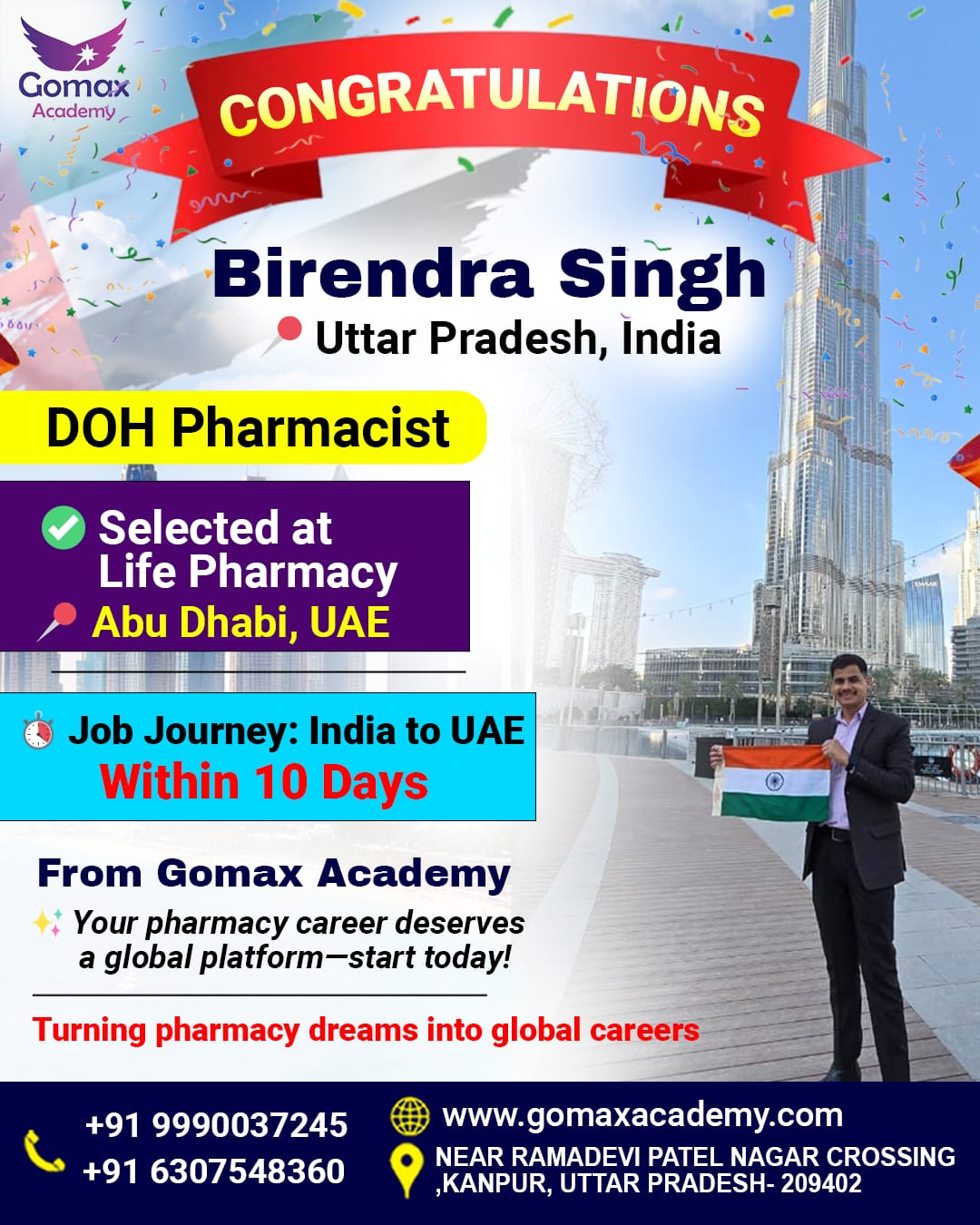 "Ambrish Maurya from Uttar Pradesh cleared the DHA Assistant Pharmacist exam in his first attempt with Gomax Academyβs expert guidance. His success motivates pharmacy professionals aiming for a Dubai healthcare career."