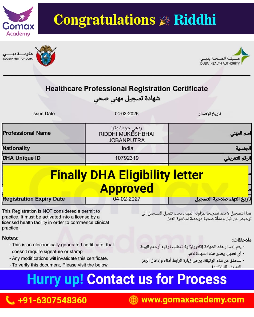 "Success Story | Gomax Academy We are pleased to announce that Riddhi has successfully received DHA Eligibility, with complete end-to-end support from Gomax Academy."