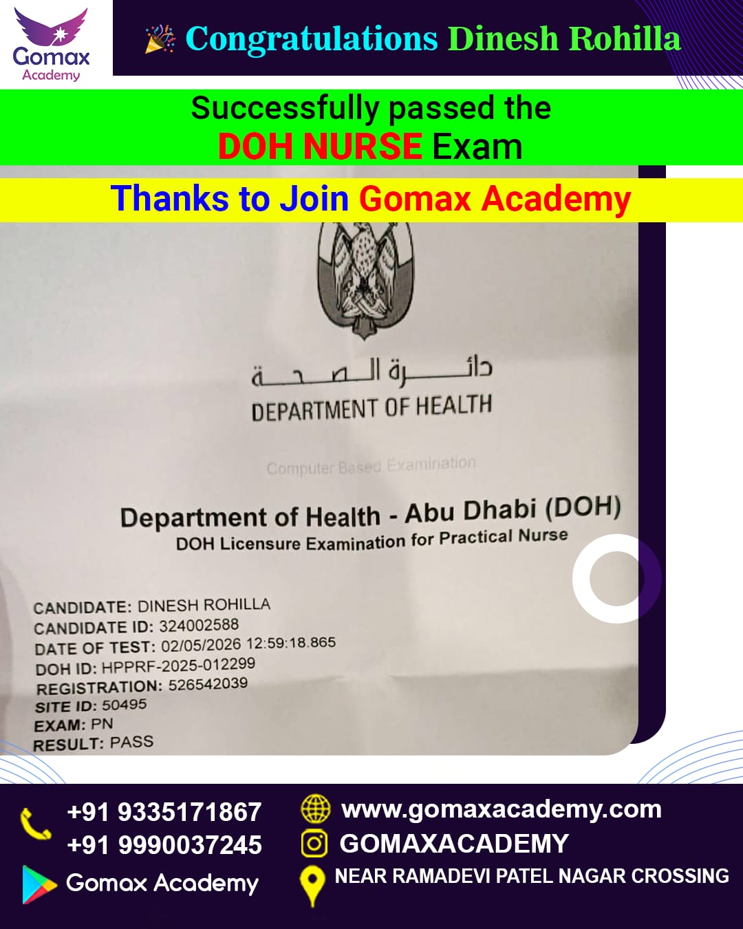 "π CONGRATULATIONS π DINESH ROHILLA!! DOH NURSE EXAM QUALIFIED β First Attempt Success π DOH NURSE Exam β PASSED Thanks to join Gomax Academy for Crash Course (Limited MCQ)"