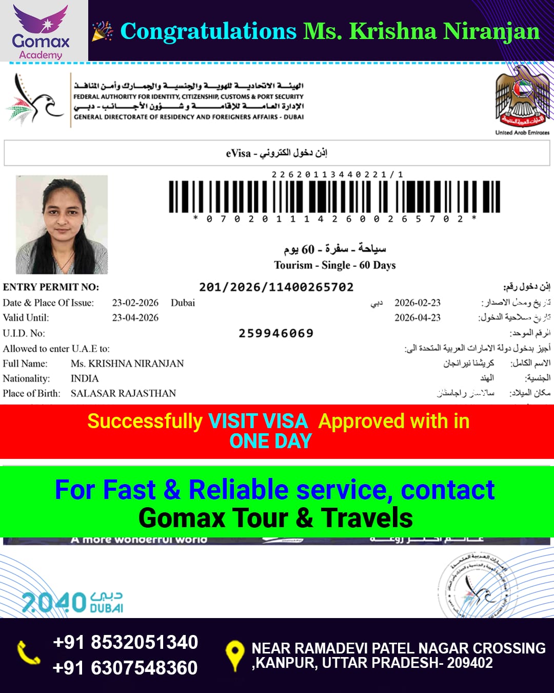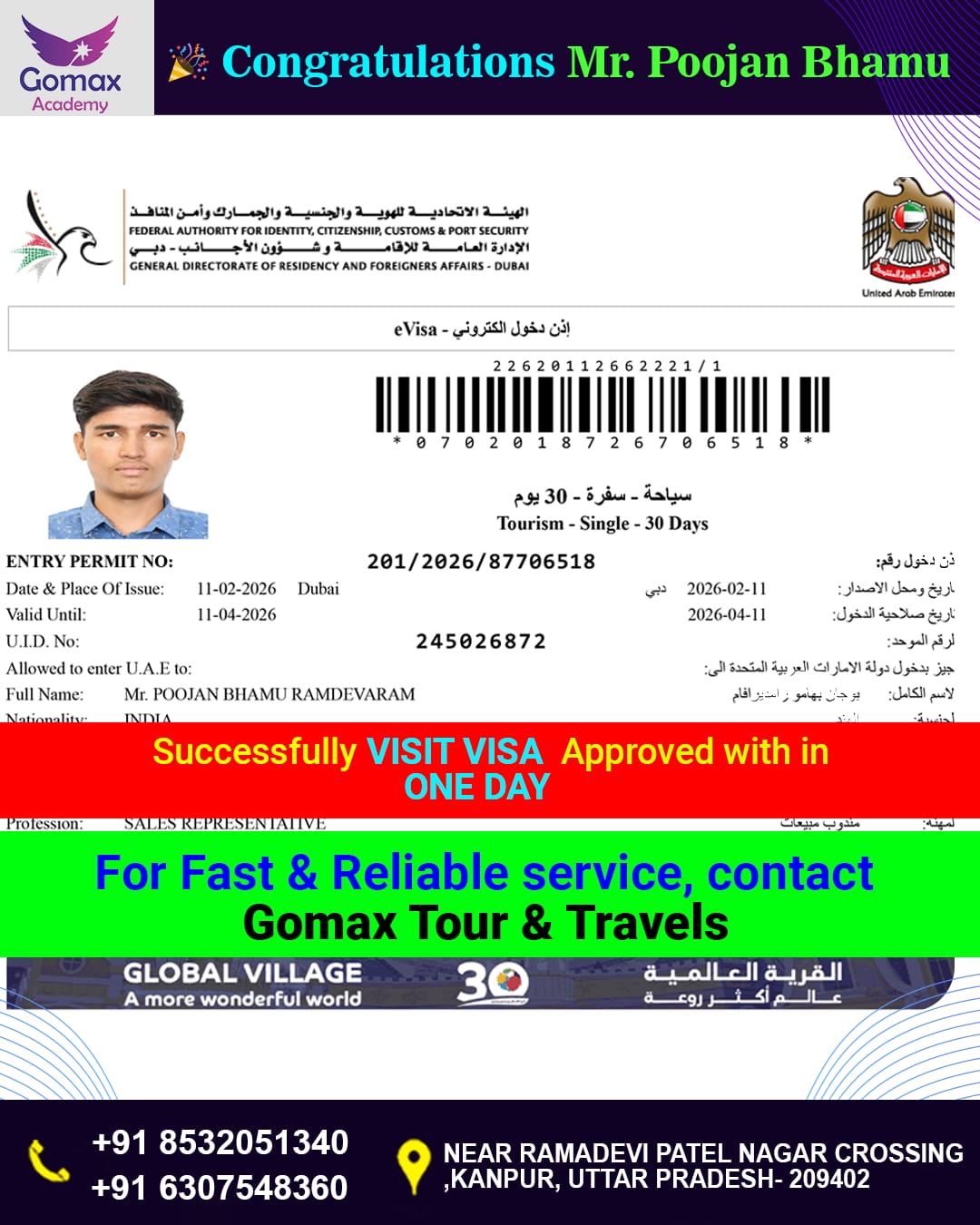 "YOUR VISIT VISA SUCCESSFULLY APPROVED WITH IN ONE DAY . FROM GOMAX ACADEMY "