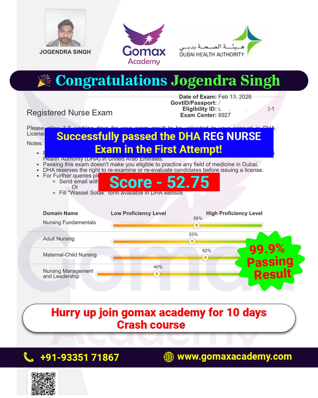 "π SUCCESS STORY β DHA REGISTERED NURSEπJOGENDRA SINGH has successfully qualified the DHA REGISTERD NURSE Exam in the first attempt with an excellent 52.75% score β "