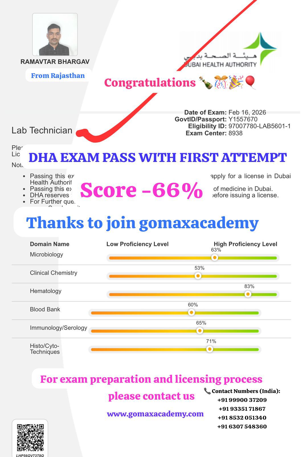 "π Congratulations π Ramavtar Bhargav π DHA Exam Qualified β First Attempt π Score β 66% Hard work + right guidance = Success π― Aapne prove kar diya ki agar preparation sahi ho to pehle attempt me bhi exam clear kiya ja sakta haiπ Agar aap bhi Nurse | Pharmacist | Lab Technician | Radiographer | Physiotherapist | Doctor hain aur DHA / MOH / Saudi / Qatar licensing exam clear karna chahte hain, to connect with Gomax Academyπ₯"