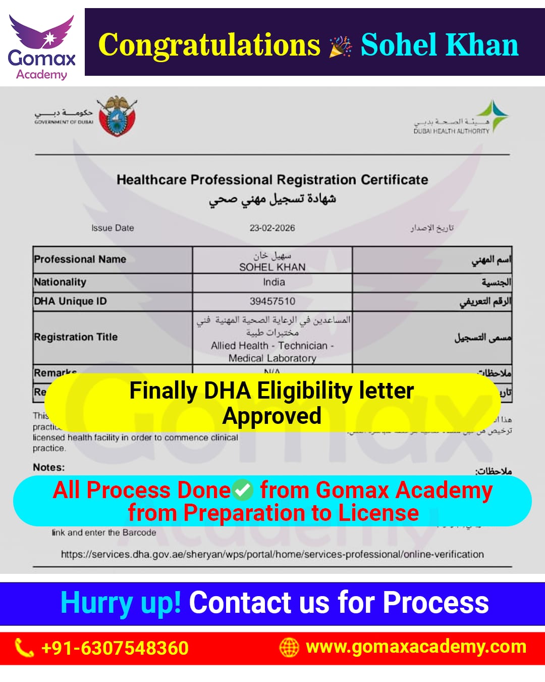 "Success Story | Gomax Academy We are pleased to announce that SOHEL KHAN has successfully received DHA Eligibility, with complete end-to-end support from Gomax Academy."