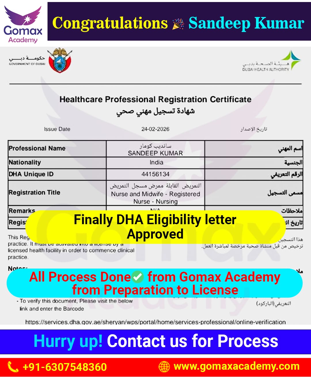 "We are pleased to announce that SANDEEP KUMAR has successfully received DHA Eligibility, with complete end-to-end support from Gomax Academy."